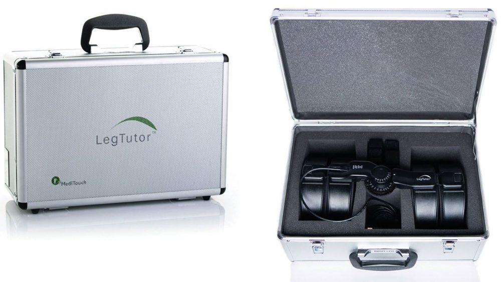 Der LegTutor™ entspricht einer Kniegelenks-Bandage, welche mittels Klettverschluss fixiert wird. Sensoren messen den aktiven und passiven ROM des Kniegelenks sowie die Position der Hüfte in Extension / Flexion, Abduktion / Adduktion und Rotation Die gewonnen Bewegungsdaten in Echtzeit werden über USB-Schnittstelle an die zugehörige MediTutor-Software übertragen.