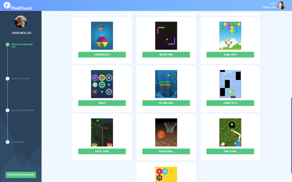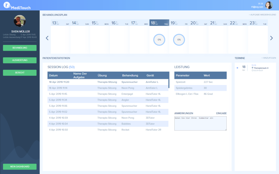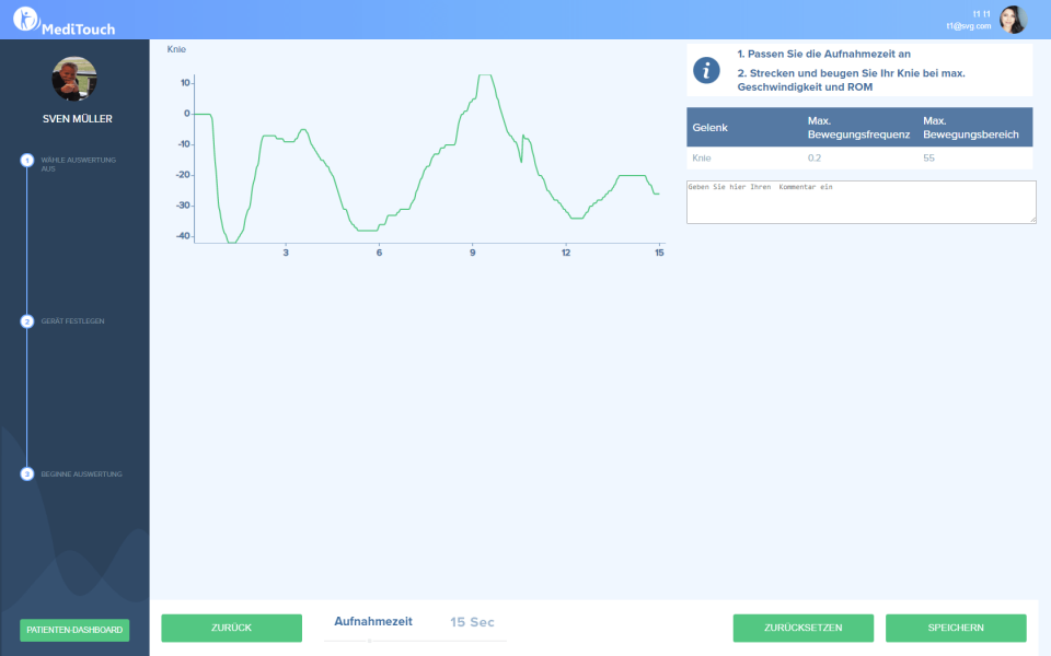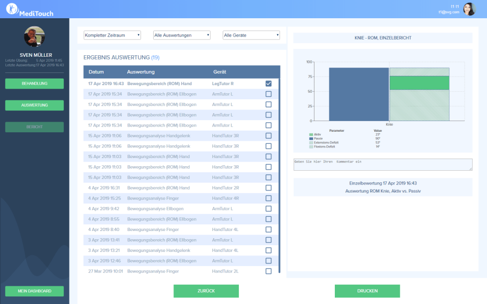 Vor dem Beginn der Therapie können mit dem LegTutor™verschiedene Tests durchgeführt werden, wie das Bewegungsausmass (ROM) aktiv/passiv und die Bewegungsgeschwindigkeit. Die Testergebnisse können in kumulierter Form in Charts angezeigt werden und geben die Entwicklungsdaten des Patienten in eindeutiger Form wieder.